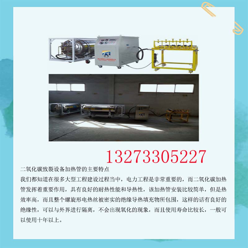 CO2致裂设备是利用液态CO2受热迅速气化,对外界进行冲击的物理致裂。 CO2致裂不会产生额外的气体粉尘等有毒有害物质,改善了工作环境。没有明火产生, 不会产生二次爆诈威胁工作人员。CO2致裂威力可控、噪音较小,在市内施工时不 会对周围环境造成较大影响。 “CO2开采器”,可以..口的CO2释放管,从而实现定向致裂的 效果。