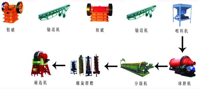 浮选法选金设备主要有:破碎机,球磨机,分级机,搅拌桶,浮选机等。