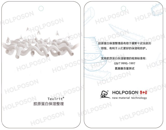 胶原蛋白整理剂HOLPOSON® Xiao Qiao中含有的多种氨基酸活性成分与人体的皮肤蛋白中的氨基酸相似,经其整理后纺织品具有持久的保湿功能。经过胶原蛋白整理后的面料手感爽滑光泽度好,透气速干,对纺织品的含水量保湿率都能有很好的改善作用。